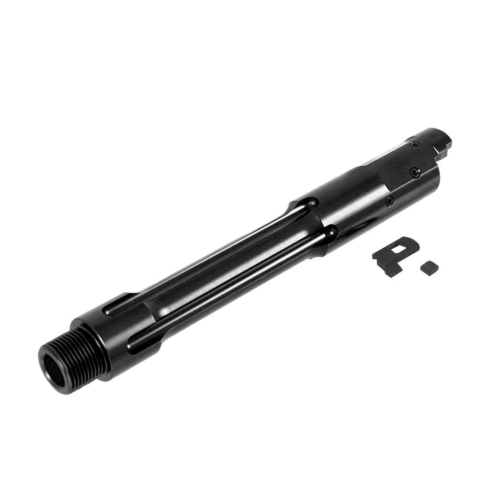 The LayLax Nine Ball TDC threaded outer barrel is an essential upgrade part for those that value performance and simplicity.  Our TDC (Top Dead Center) outer barrel uses existing parts found in the stock Tokyo Marui hop-up chamber in combination with our own patch and a simple grub screw to achieve optimal performance without having to change or overhaul any internal part.  Taking advantage of the already well made stock TM chamber makes the installation process easy and with the reinforced anchoring from our screws, the barrel will not shift from the recoil impulses of your gas pistol.  Finally, with the addition of threads, you can mount any mock suppressor, tracer, and/or muzzle device compatible with 14mm CCW threads.