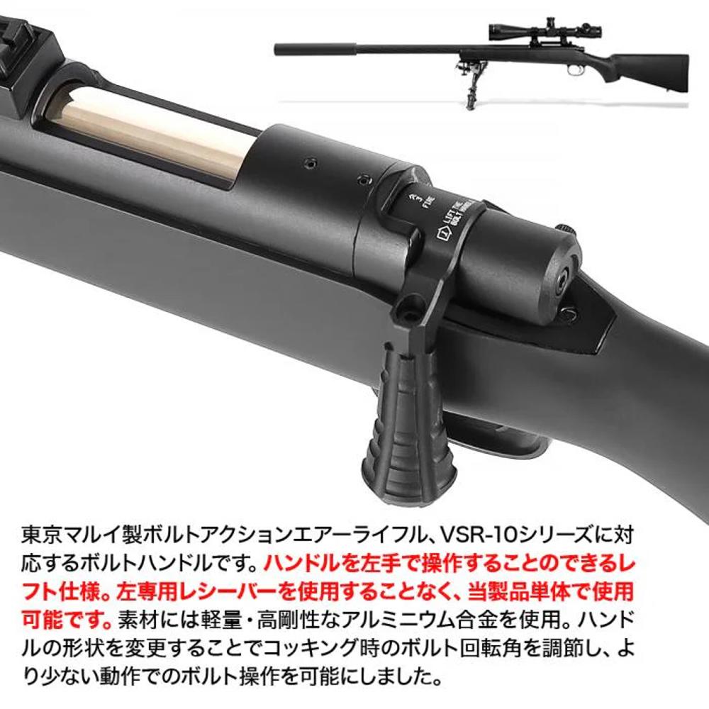 The LayLax PSS bolt handle NEO for the Tokyo Marui VSR-10 series airsoft snipers is an ideal upgrade for those that want to take full advantage of their rifle.  The handle folds down in a nearly straight manner, making it more streamlined and more compact.  The handle at "ful charge" comes up at near full horizontal which makes chambering and rechambering easier.